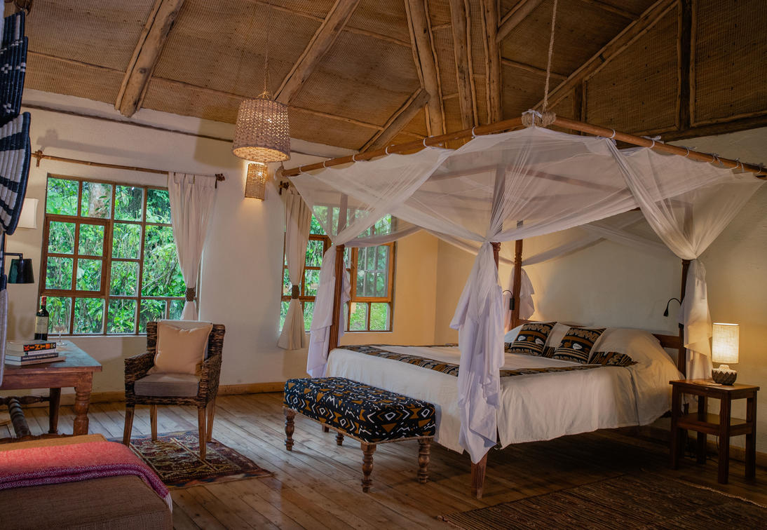 Volcanoes Bwindi Lodge offers ten charming bandas, each designed with local stone, timber, and thatch to blend naturally into the forest environment. Every banda is named after a gorilla in Bwindi, adding a personal touch that many guests enjoy.